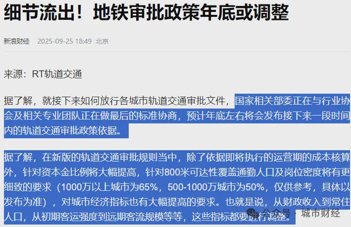 估计岁尾(2025年岁尾)摆布将会发布接下来一段时间内的轨道交通审批政策根据。以及项目开通运营10年后未实现现金流均衡的地域,
